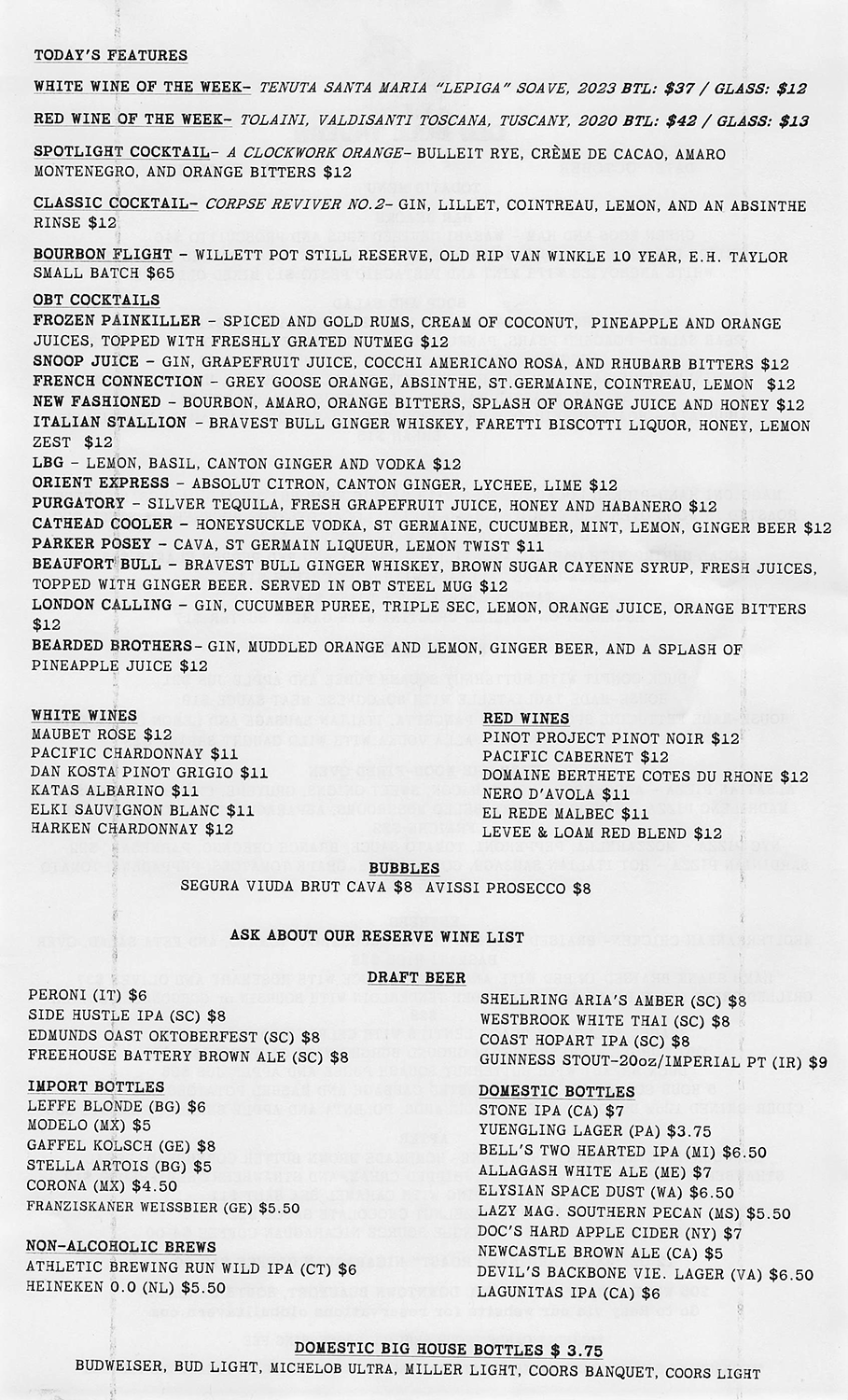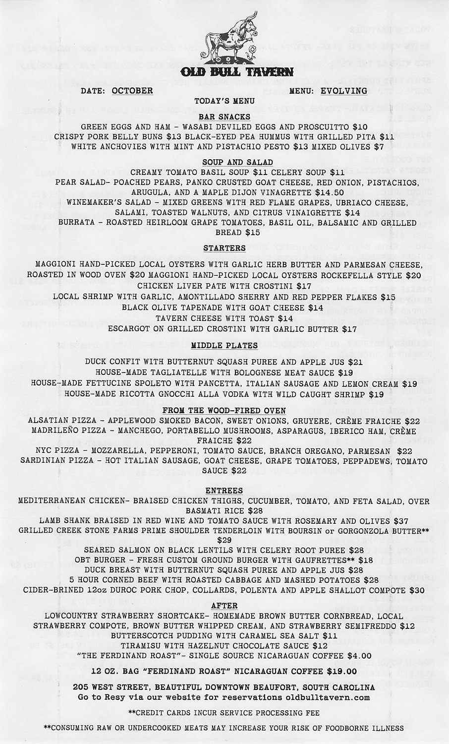 The Old Bull Tavern is Beaufort’s One and Only high-energy, eclectic, friendly neighborhood Gastropub featuring an ever-changing, market-based menu of European and American comfort foods, innovative cocktails, select craft beers, and wines in bottle and on tap.
